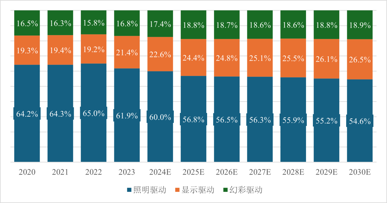 受下游舞台灯饰、汽车氛围灯等细分市场需求驱动,根据赛迪顾问估算,2023年LED幻彩驱动芯片20.2亿元,同比增长12.5%,优于中国模拟和数模芯片市场平均水平(2023年3800亿元,同比降幅7.2%)。随着下游应用场景的丰富,预计到2030年,幻彩驱动芯片规模将接近70亿元,在LED驱动芯片占比将进一步提升。