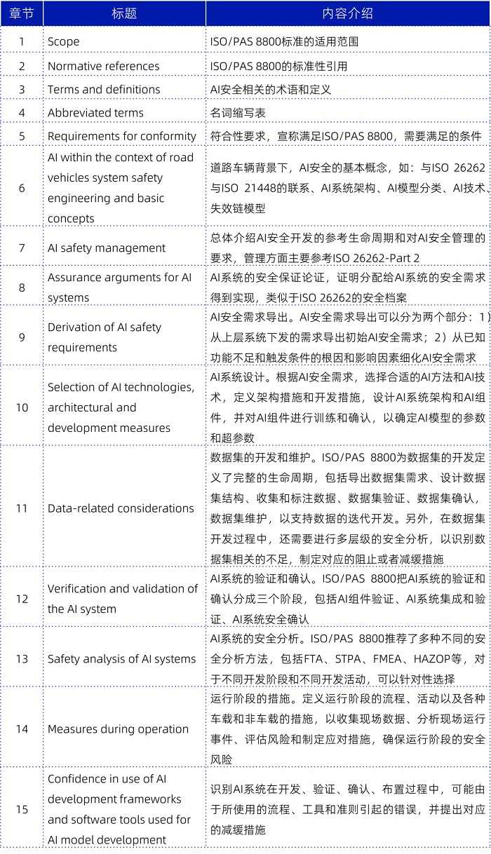 ISO/PAS 8800共包含15个章节,涵盖了人工智能安全开发的全生命周期。该标准既包含“V”模型左侧的需求导出、系统设计与实现,也涵盖“V”模型右侧的验证与确认环节。