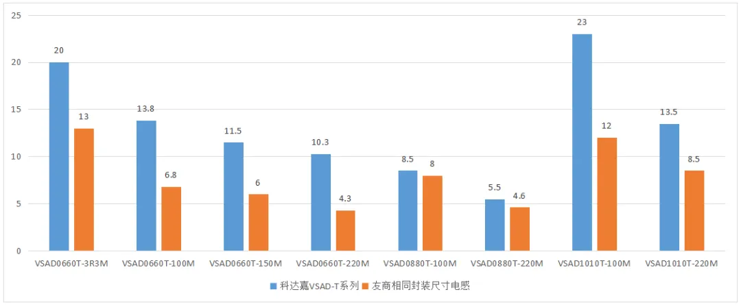 图3 VSAD-T系列与相同封装尺寸电感饱和电流对比