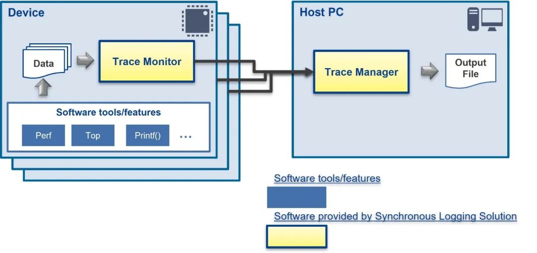 Sync Logging由运行在Host PC上的Trace Manager和运行在设备上的Trace Monitor这两个工具组成。设备上运行的软件或工具输出的数据会经由Trace Monitor传送到Host PC上的Trace Manager。Trace Manager会将来自多个设备的数据按时间顺序排列并输出。通过分析这些输出数据,可以掌握同一时间各个设备上的软件正在执行什么样的处理,以及系统的负荷情况如何。