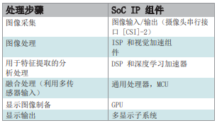 表 2 说明了简单环视监控应用和更复杂的自动代客泊车用例中常用的处理步骤和 IP 组件。
