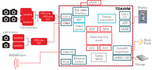 图 1 所示为 TDA4VM 器件在环视用例中的简化方框图。