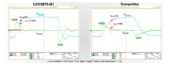 TI的UCC5870-Q1和UCC5871-Q1是高驱动电流、符合TI功能安全标准的30A栅极驱动器,具有基本隔离或增强隔离等级功能,以及用于与微控制器进行故障通信的SPI串行外设接口数字总线。图3对UCC5870-Q1和一同类竞争栅极驱动器间的SiC MOSFET导通情况进行了比较。UCC5870-Q1栅极驱动器的峰值电流为39A,并在米勒平台保持30A的电流,导通速度非常快。通过比较两个驱动器之间的蓝色VGATE波形斜率,也可明显看出其导通速度更快。米勒平台电压为10V时,UCC5870-Q1的栅极驱动器电流为 30A,而同类竞争器件的栅极驱动器电流为8A。