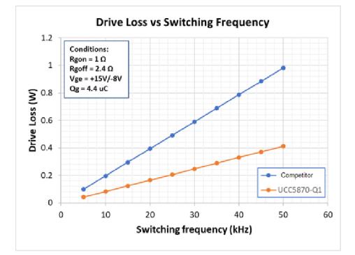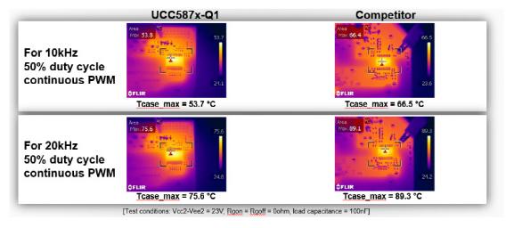 图 5:UCC5870-Q1和同类竞争栅极驱动器在驱动SiC FET方面的热耗散