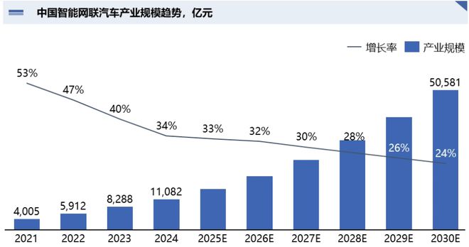 其中,智能驾驶将带动万亿级产业发展。根据《中国智能驾驶商业化发展白皮书》显示,2024年我国智能网联汽车产业规模达11082亿元,增速为34%,预计到2030年市场规模有望突破5万亿。