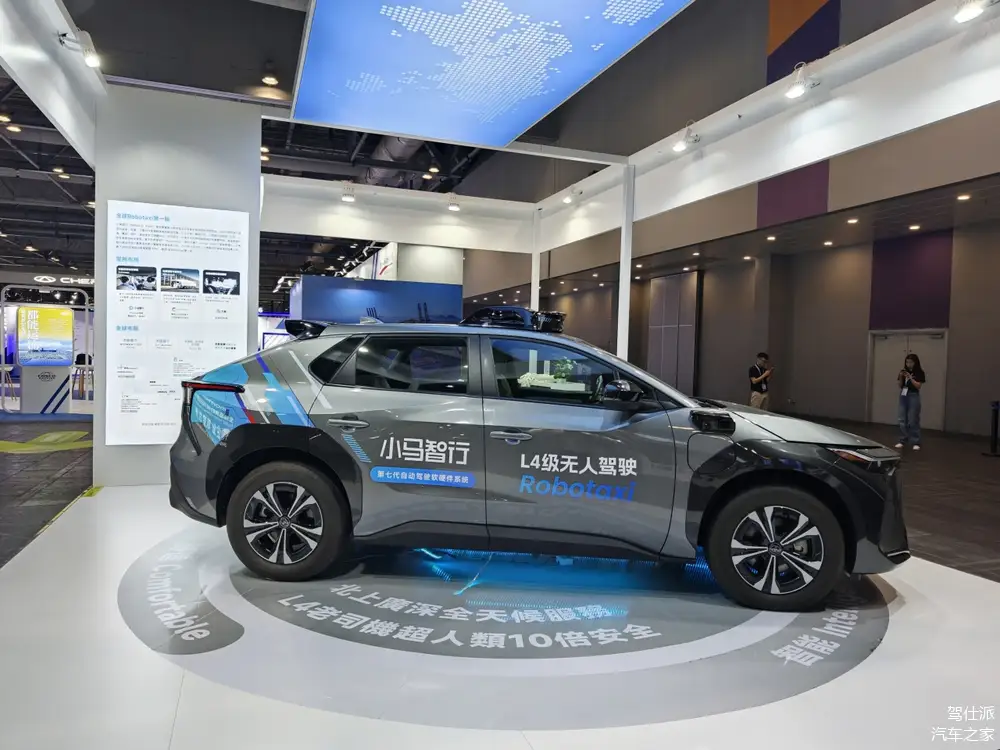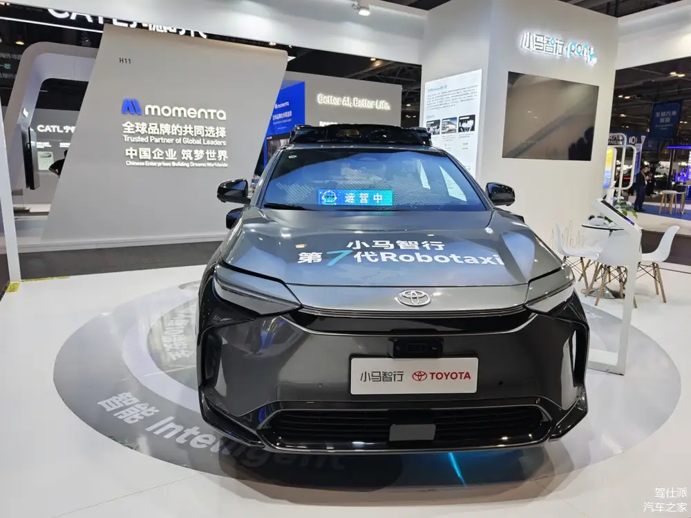 至于车辆,这次小马智行使用的是丰田bZ4X进行改装,基本上也是一款非常成熟的产品。而且可以看到,在前挡风玻璃后面做了一个彩色显示屏来展示车辆的运行状态,包括和行人/人驾车辆的交互指令,这样更便于和外界沟通。
