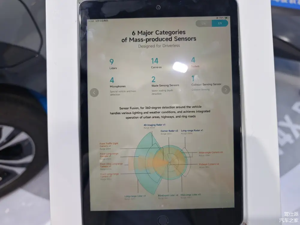 小马智行此次带来了第七代自动驾驶车辆方案。展示的是一个L4级别自动驾驶的车型,包括全车9颗激光雷达、14个摄像头、4个毫米波雷达、4个麦克风、2个涉水感应器、1个碰撞传感器。