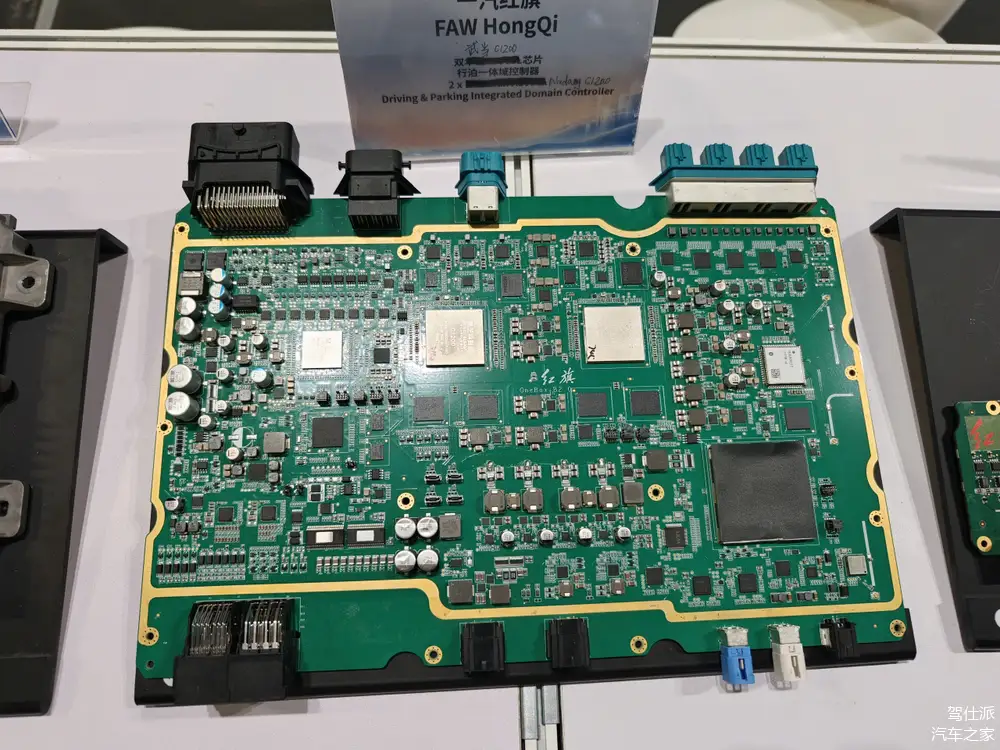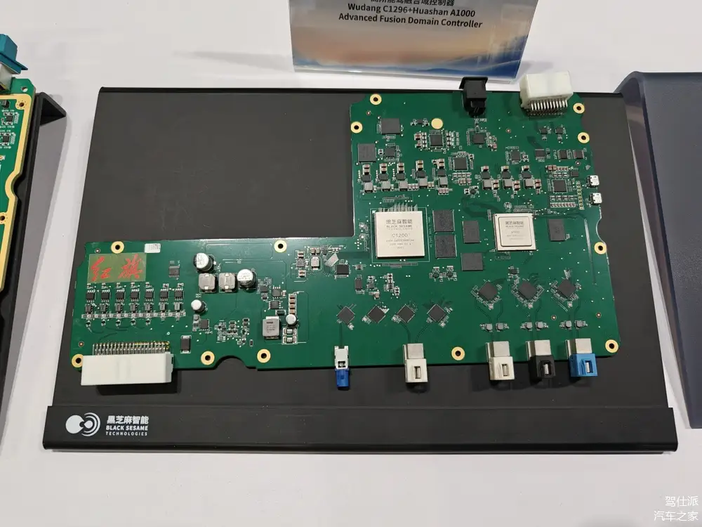 现场可以看到的是黑芝麻展示了一汽红旗采用黑芝麻方案做的两款主板,武当C1200能够以两颗芯片在同一个主板上实现行泊一体域控制,也可以用一颗C1296+A1000实现舱驾融合域控制器,而且后者的芯片数量明显要少得多。