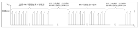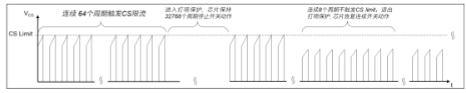 触发条件:当连续64个开关周期检测到CS限流则会触发打嗝(Hiccup)保护,芯片保持32768个周期停止开关动作;当触发打嗝保护后,在不满足退出条件时,若累计有64个开关周期检测到CS限流,则仍会启动打嗝(Hiccup)保护。