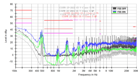 支持扩频与双随机抖频模式(-3 / -4 / -5 / -6 尾缀型号支持),通过在中心频率周围引入周期性与伪随机调制,实现开关频率的规律与随机扰动叠加,有效分散频谱能量集中点,显著降低中低频EMI干扰峰值,帮助系统轻松通过CISPR 25 Class 5等严苛车规EMC测试。