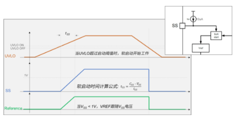 通过SS引脚外接电容即可灵活设定软启动时间,控制输出上升斜率,在上电与启动阶段有效抑制浪涌电流,保护功率器件与后级负载稳定启动;