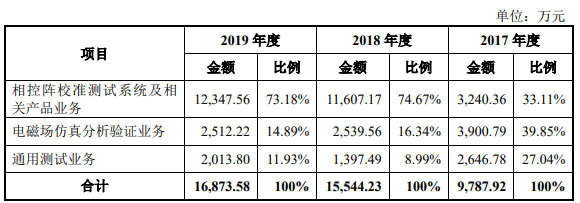 其中,报告期内相控阵校准测试系统及相关产品业务营业收入分别为3,240.36万元、11,607.17万元、12,347.56万元,占总营收的比例为33.11%、74.67%、73.18%;电磁场仿真分析验证业务营收分别为3,900.79万元、2,539.56万元、2,512.22万元,占总营收的比例为39.85%、16.34%、14.89%;通用测试业务的营收分别为2,646.78万元、1,397.49万元、2,013.80万元,占总营收的比例为27.04%、8.99%、11.93%。从三大业务来看,相控阵校准测试系统及相关产品业务的营收逐年增加,而电磁场仿真分析验证业务与通用测试业务的营收及占比却出现下降的趋势。